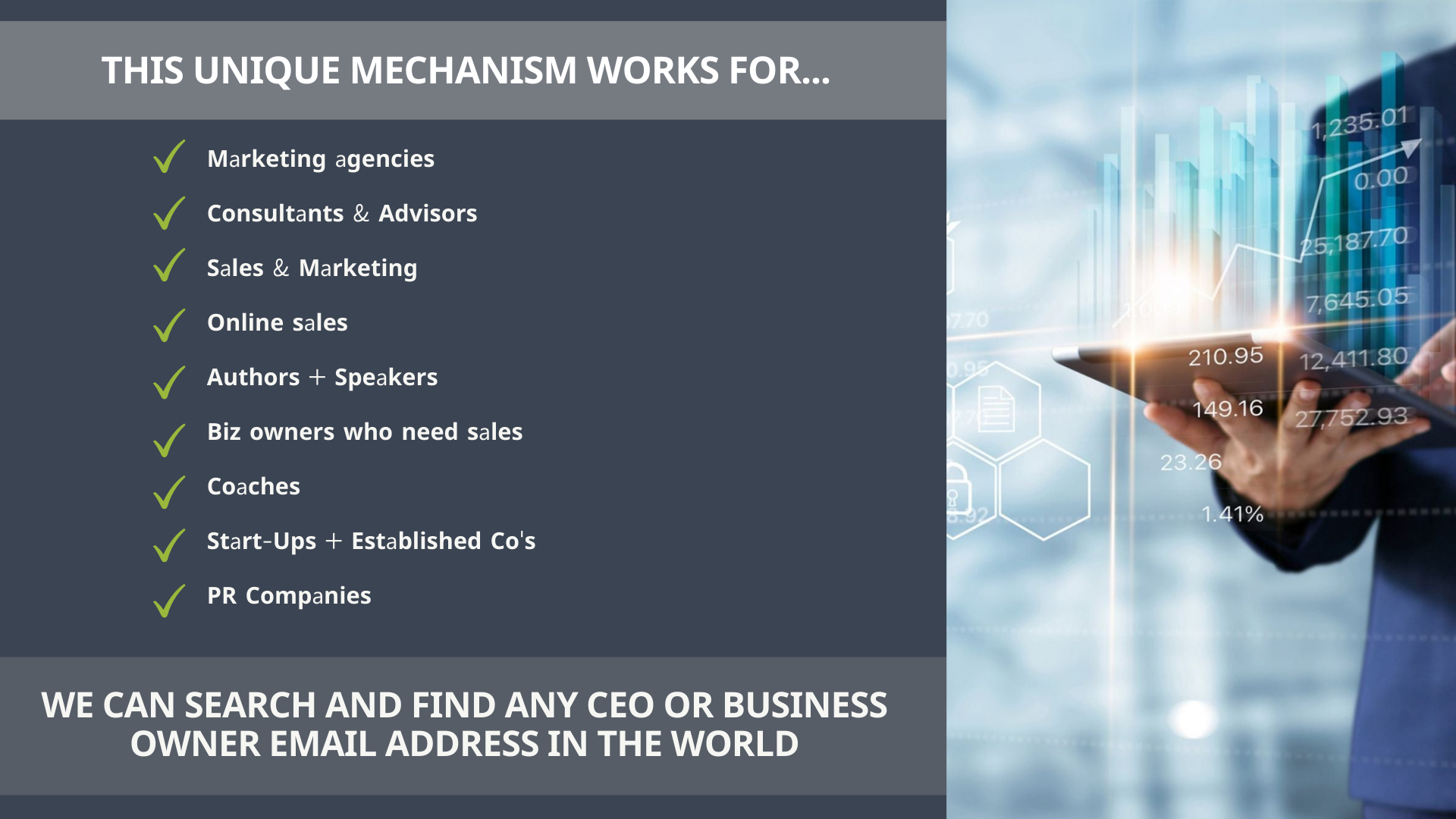 We will Search and Find the Email Address of any CEO or Business owner in the World which means the email sequence is always Personalised.